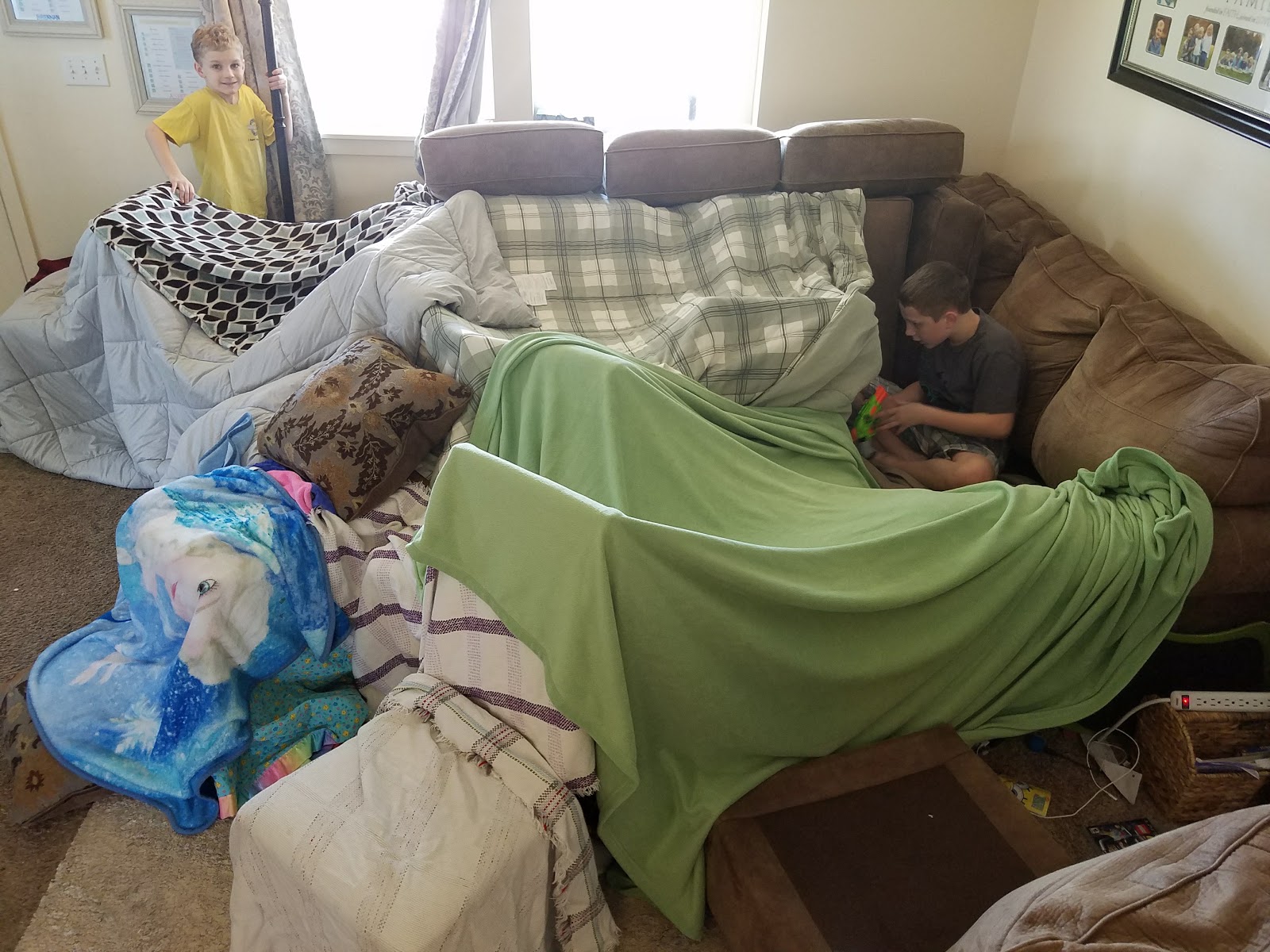 The kids built "Grand Central Fort" in the living room I got the tour inside were they each had roomy bedrooms. Every year coincidentally just before St. Patrick's Day I clean out under the couch cushions. The rest of the year I pretend there isn't a problem there, and the cushions must stay in place to hide it. ;-) But when those leprechauns come through and move the cushions, it ignites fort ideas with the kids. So basically, I had nowhere to set for several days after the holiday.